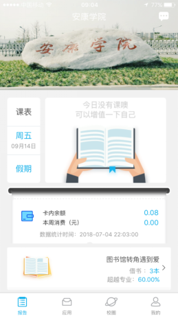 在首页(即报告页面)可查看课表,一卡通内余额,图书馆借阅等信息。