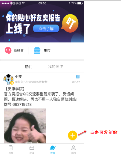 校圈是一个社交和通知的模块,用户可以在这一模块发布不同类型的帖子与本校的用户进行社交互动,校圈分新鲜事与集市两个板块。